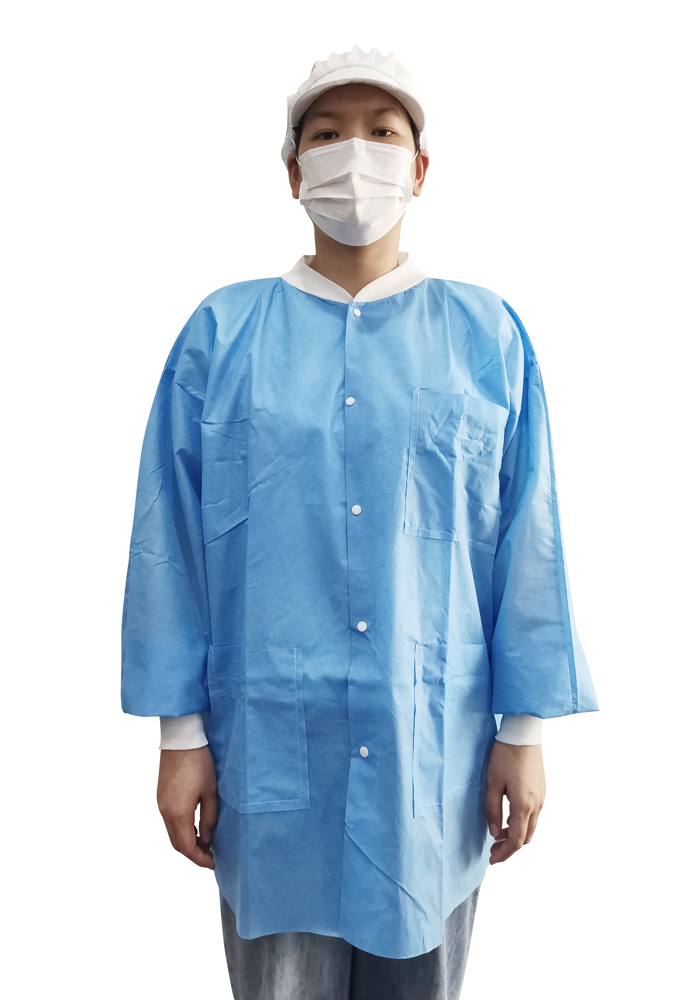 SMS Material: A three-layered nonwoven fabric with spunbond layers for strength and a meltblown layer for filtration. They provide higher protection than just polypropylene as the meltblown layer acts as a filtration barrier against particulates and limited fluid exposure. It is breathable, which helps maintain comfort during extended wear, and is suitable for environments where there is moderate risk of exposure to splashes and particles.